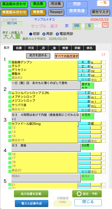 下記以外に小児科用ですが、ワクチンのQRリーダーを使ったロット記載や、次回のワクチンを表示できるようクリニックがわで利用できる「こどもデジタルクリニック」も組み込んでいます。体重投与量も医師の考えで自由にスピーディーに作成できます。(処方名人という名称で当院で20年以上使用し、改良した処方せん発行システムを組み込んでいます。)