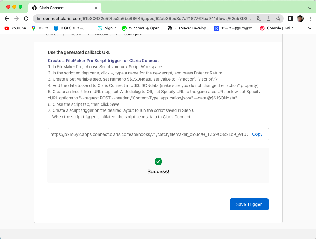 Google Formの設定方法ーを参照してGoogle formのトリガーも準備しておきます。フォームを送ります。Save Triggerにいるが付きました。押しておきます。